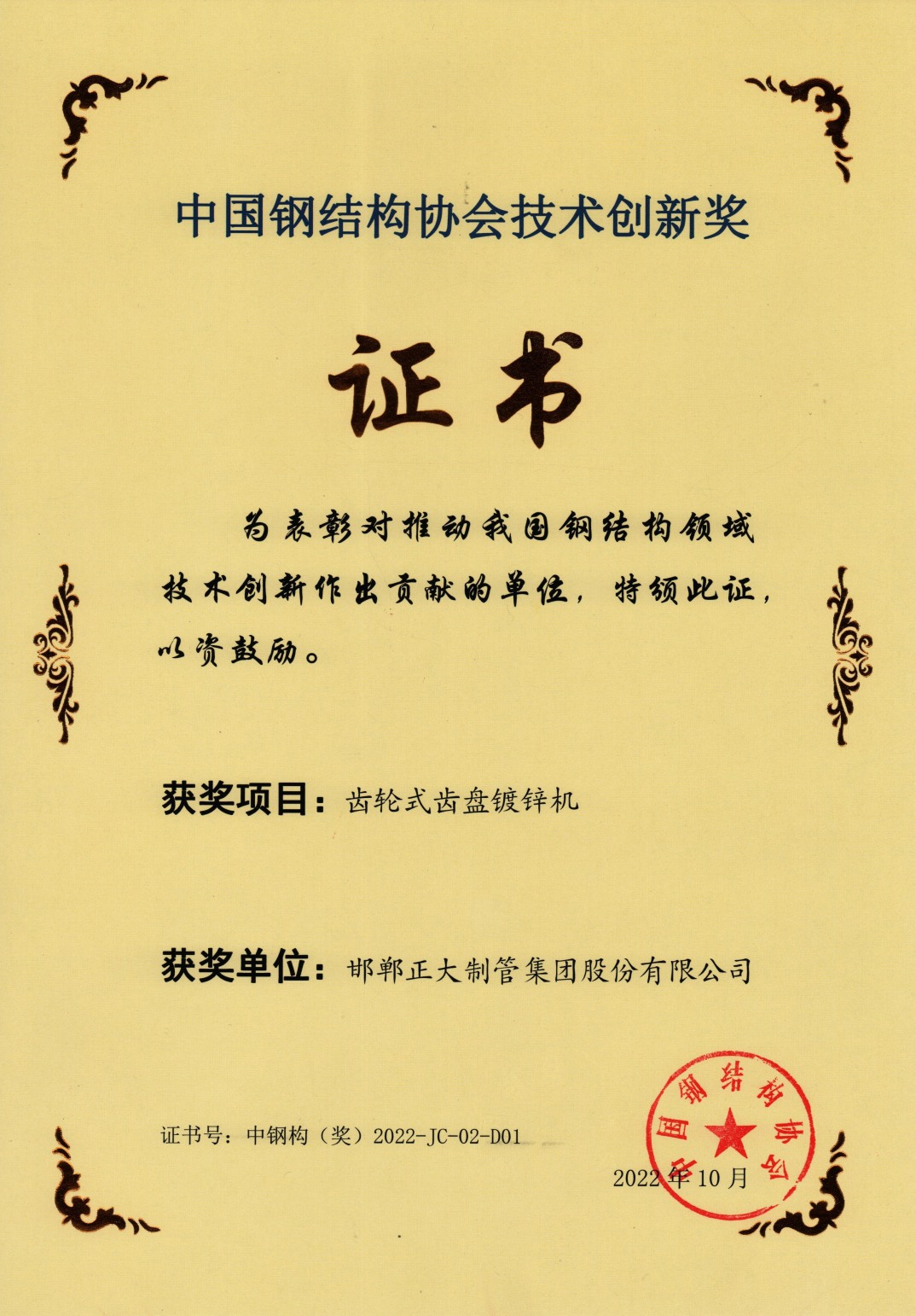 近日,中國鋼結構大會暨粵港澳大灣區鋼結構發展峰會在廣州召開,會上對獲得中國鋼結構協會2022年度科學技術獎的單位頒獎,正大制管申報的《齒輪式齒盤鍍鋅機》項目獲得中國鋼結構協會“技術創新獎”。